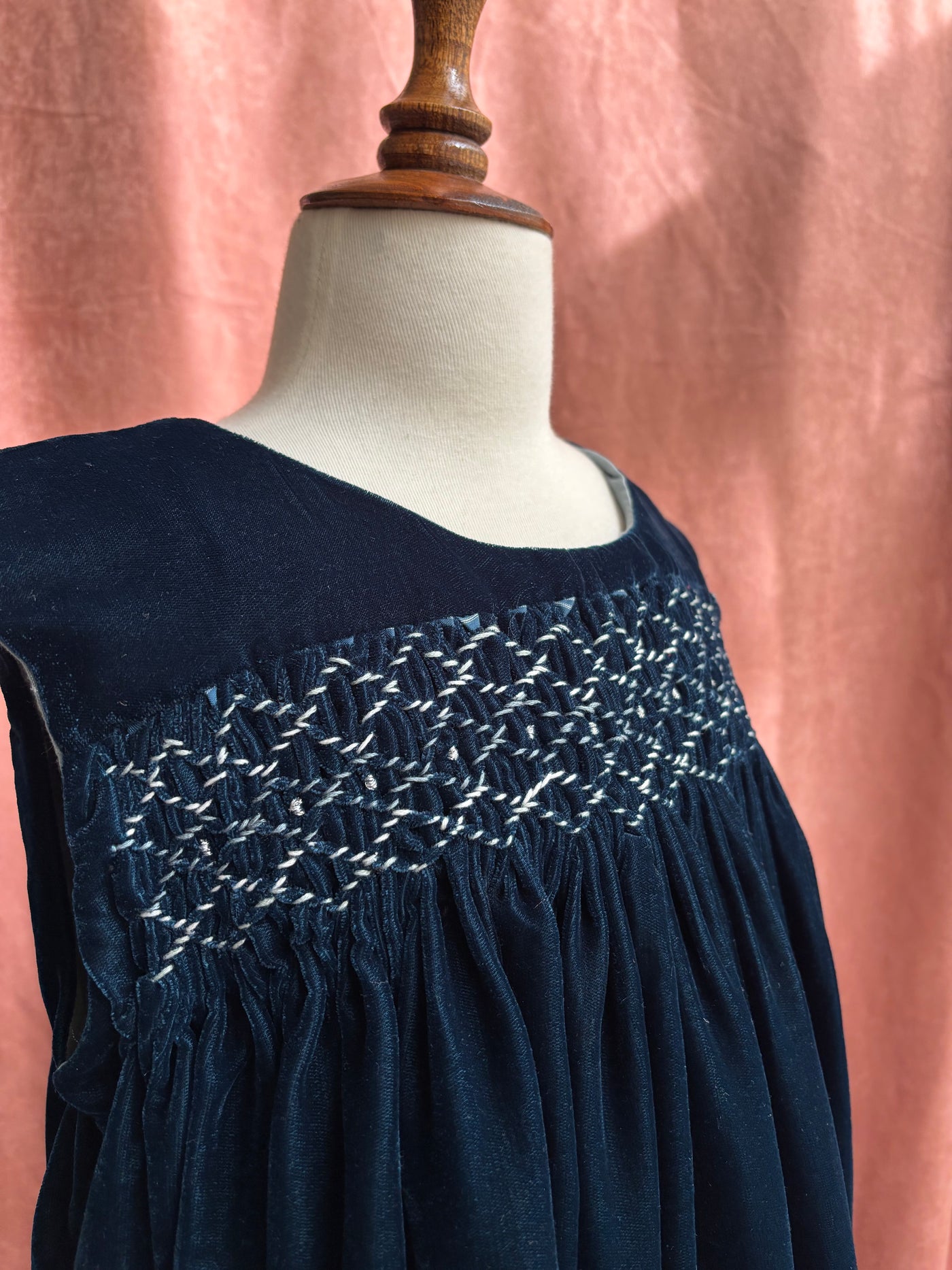 Hand-smocked teal blue velvet dress with delicate silver thread smocked detailing. A timeless winter heirloom, made to order. ✨