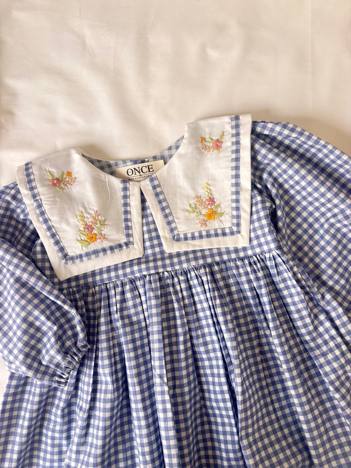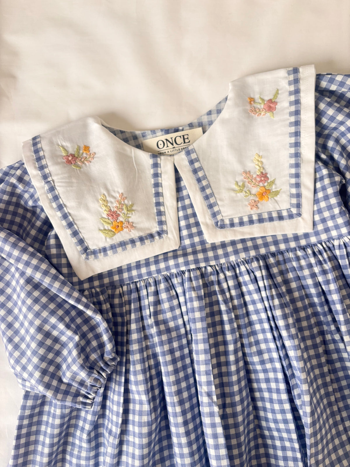 Soft blue gingham, delicate florals, and a classic sailor collar — a dress made for childhood summer days.