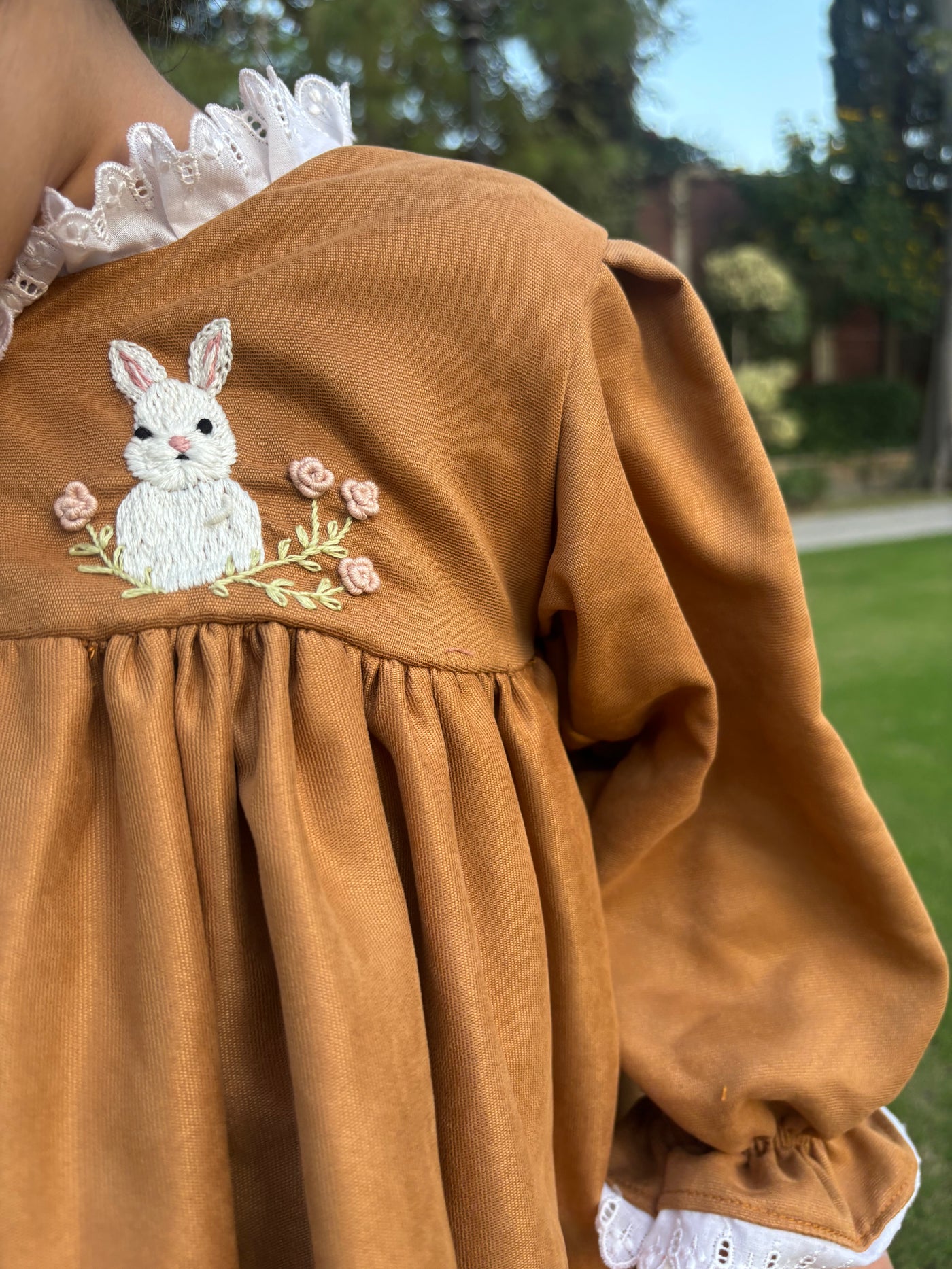 A cozy corduroy dress in a warm caramel shade, beautifully detailed with hand-embroidered bunny and floral motifs. The gathered bodice and puff sleeves bring a touch of vintage charm, while the lace neckline adds a dainty, storybook finish. Perfect for autumn days and cozy winter moments.