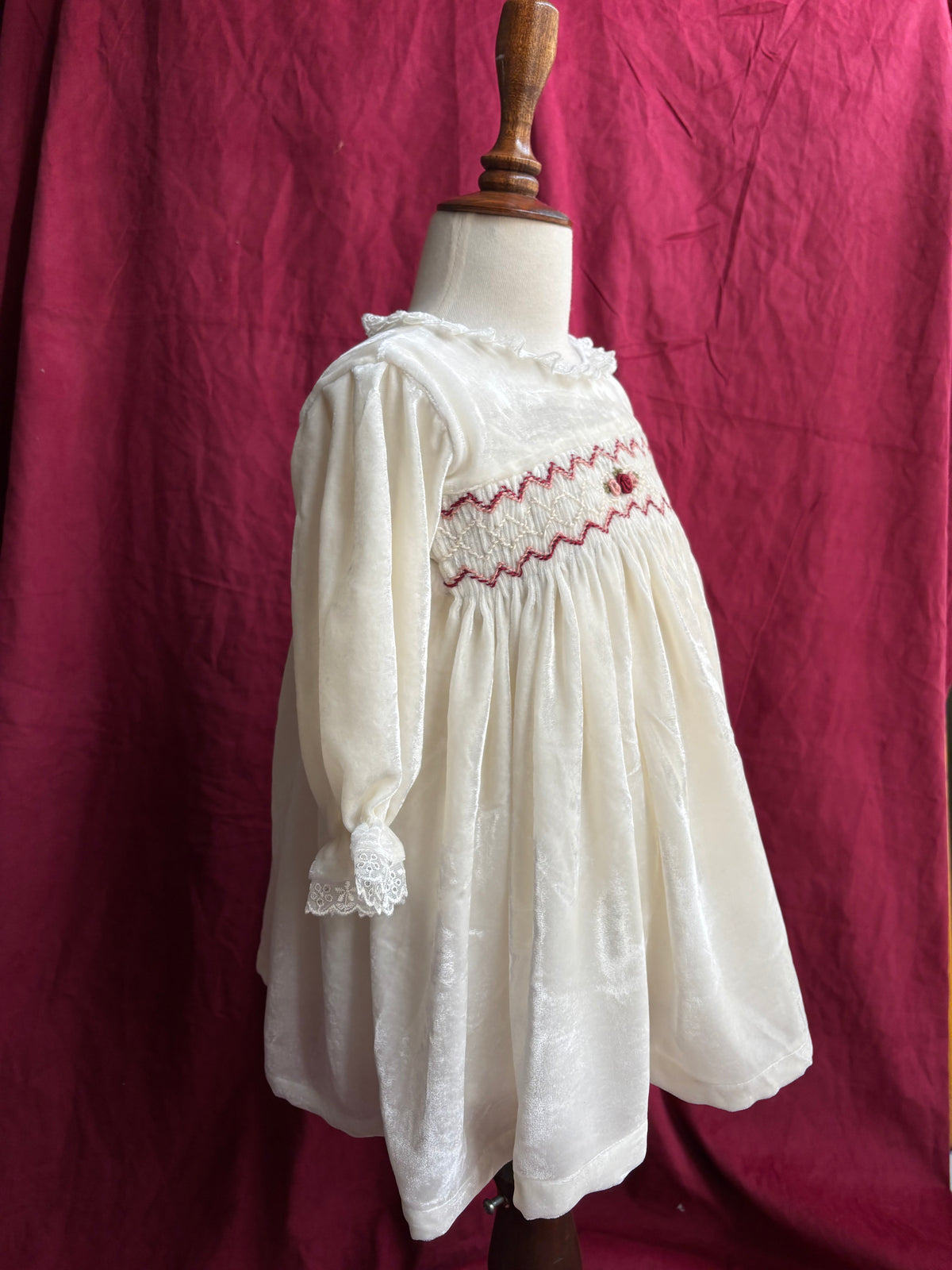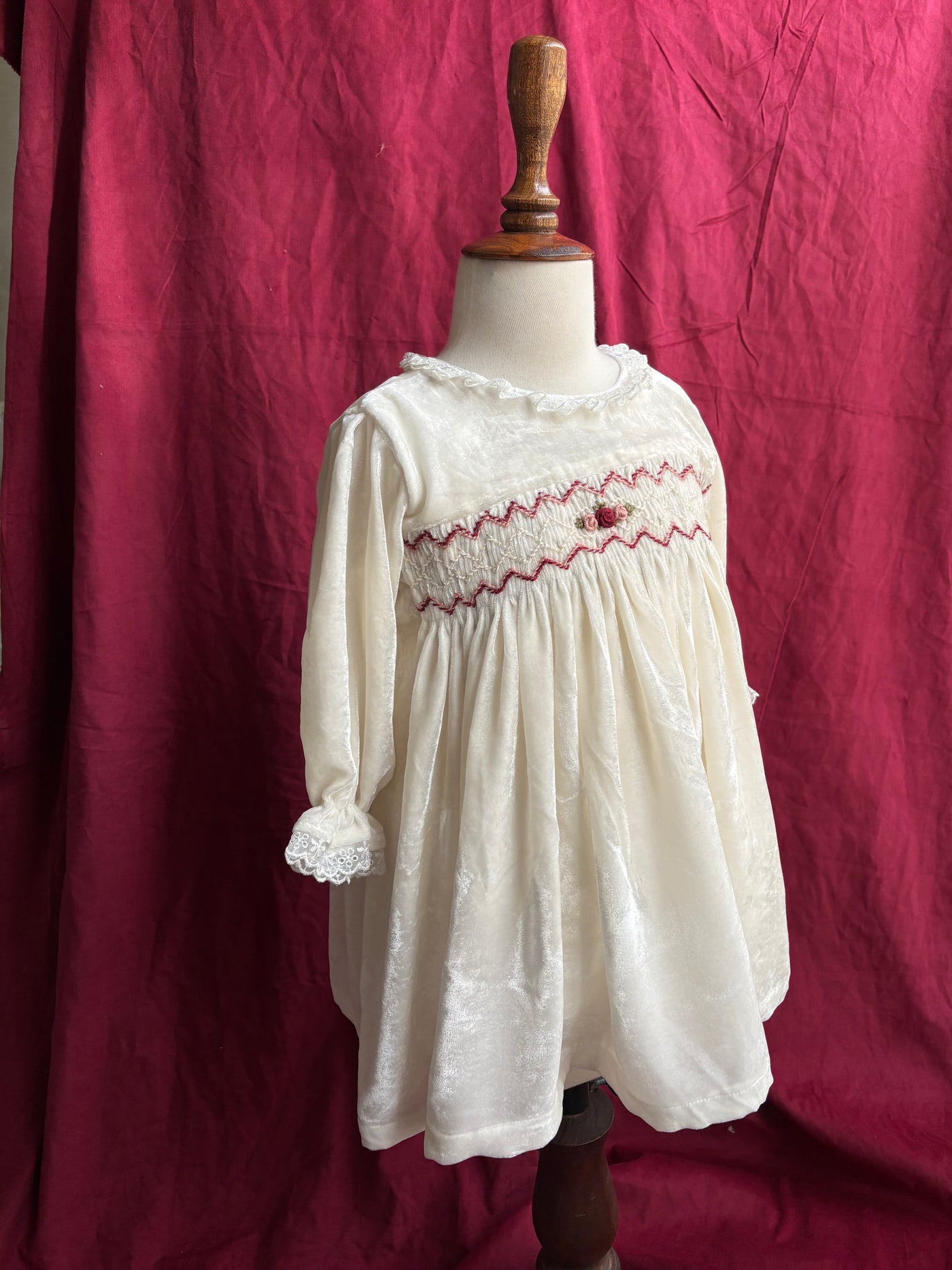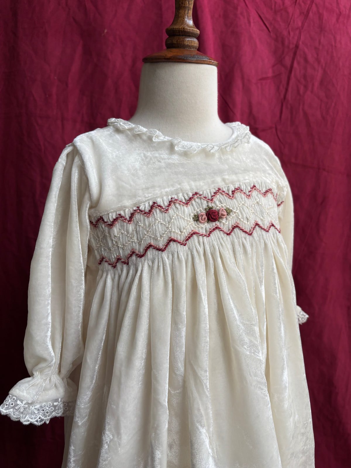 A timeless ivory velvet dress featuring delicate hand-smocking in deep red tones, finished with tiny rosebuds, lace-trimmed sleeves, and a soft gathered fall. Perfect for winter festivities and special moments.