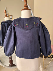 Navy corduroy shirt featuring scalloped collars with cherry embroidery detail. Pair it with skirts or denims.