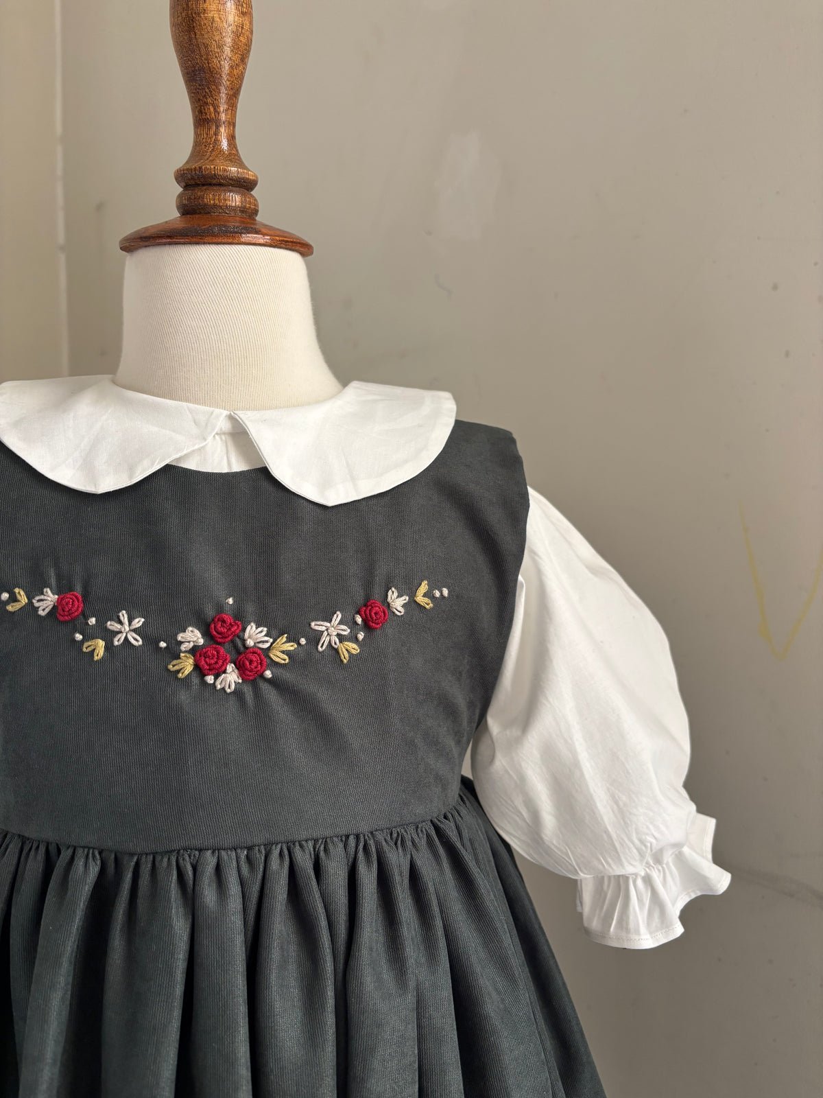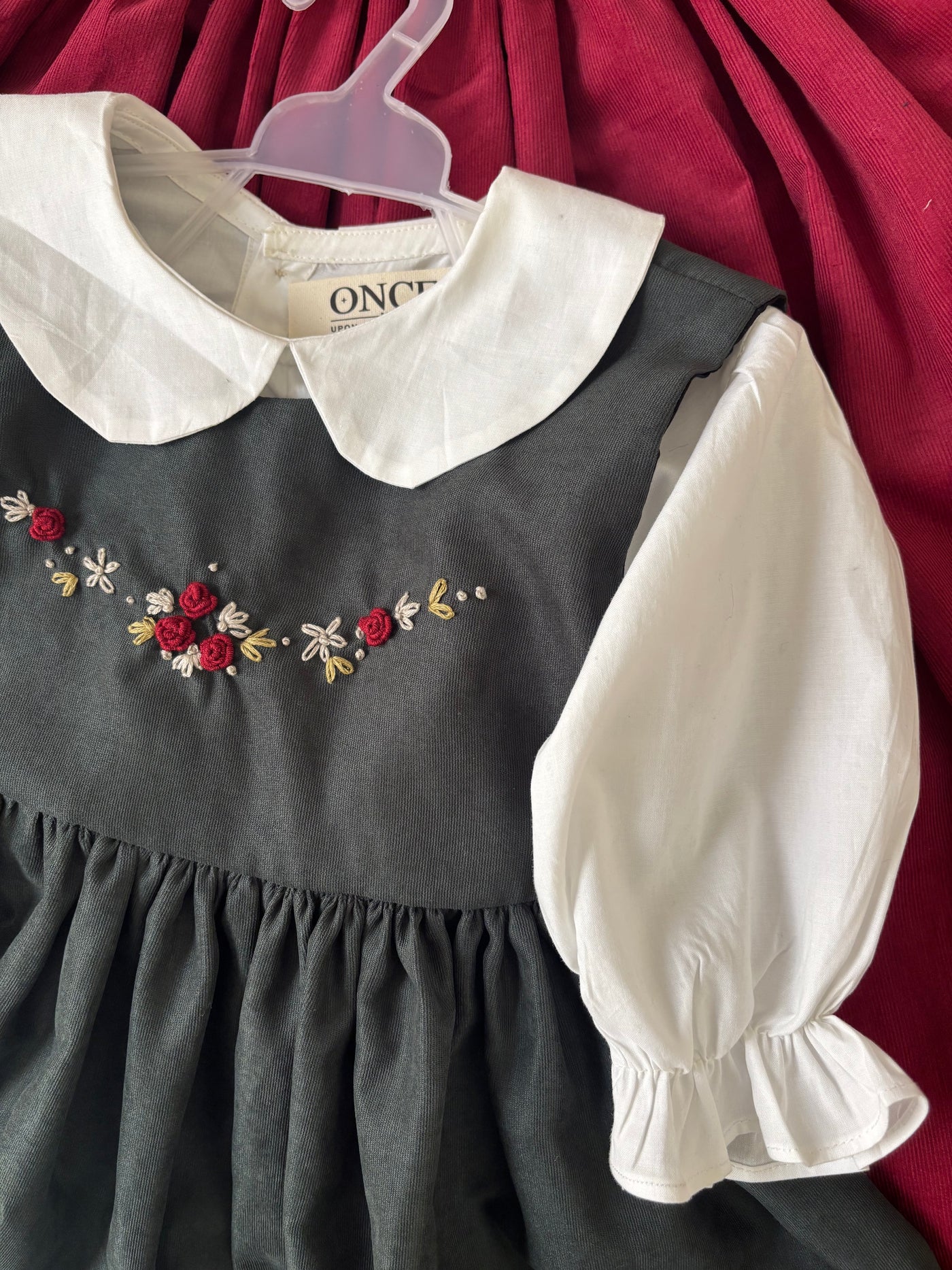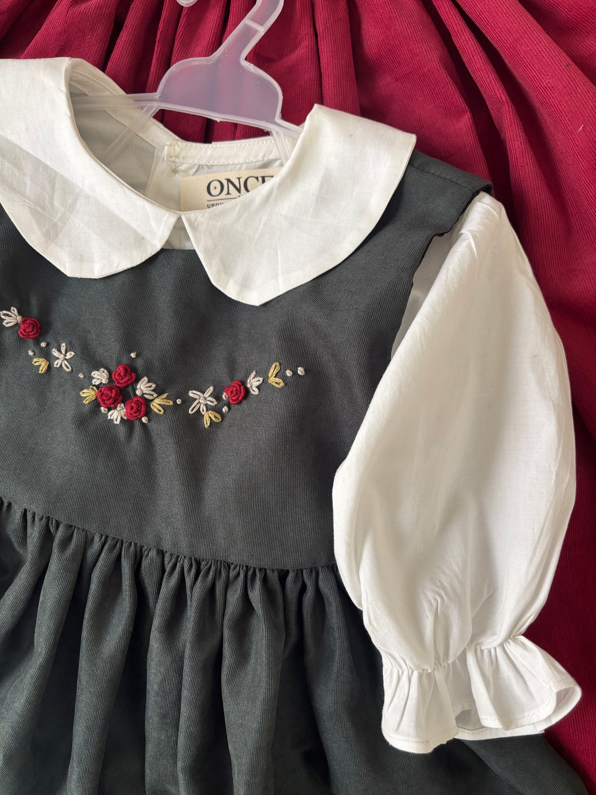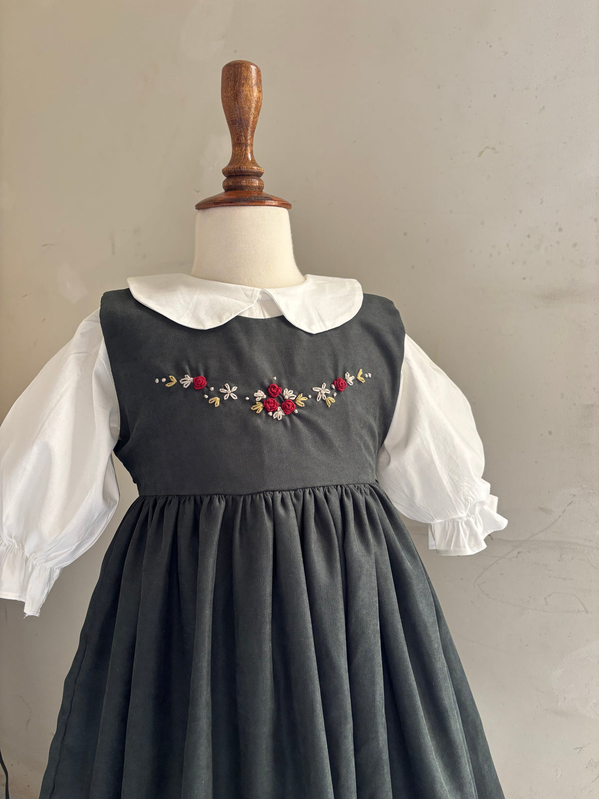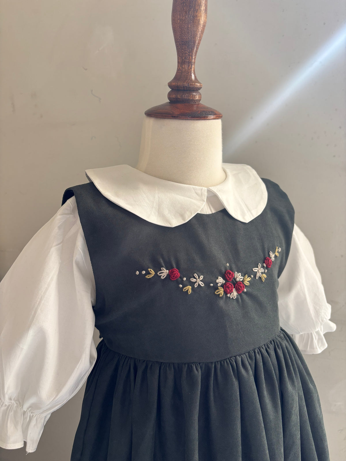 A heartfelt recreation of a childhood memory — this dress is inspired by the one I wore as a little girl. It carries the same forest-green bodice, delicately hand-embroidered with tiny blooms, paired with a crisp white undershirt and soft puffed sleeves. Finished with a Peter Pan collar, it’s a timeless piece stitched with nostalgia and love — a gentle reminder of the dresses our mothers once dressed us in.