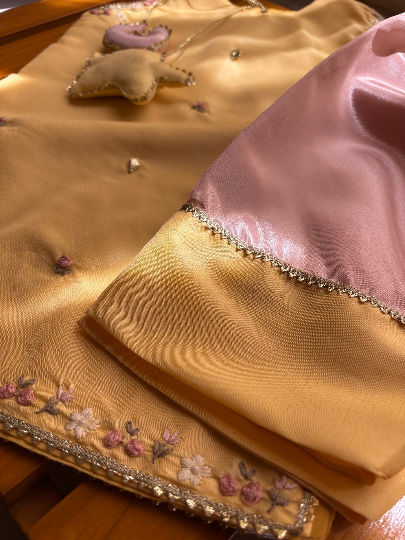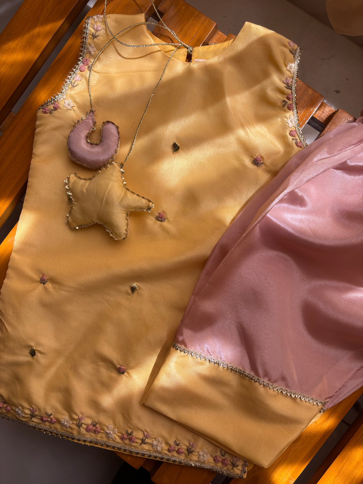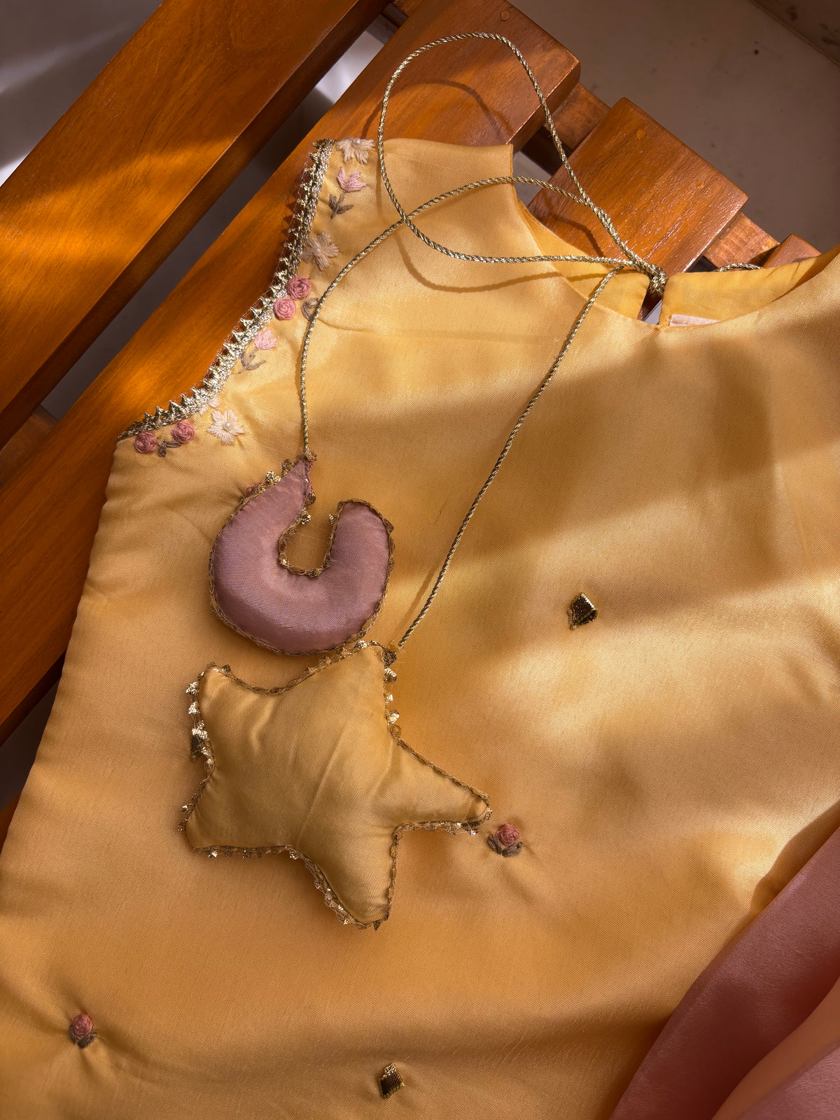A soft golden festive outfit with delicate floral embroidery, paired with a blush satin bottom. Finished with charming moon and star details, perfect for Eid and special celebrations