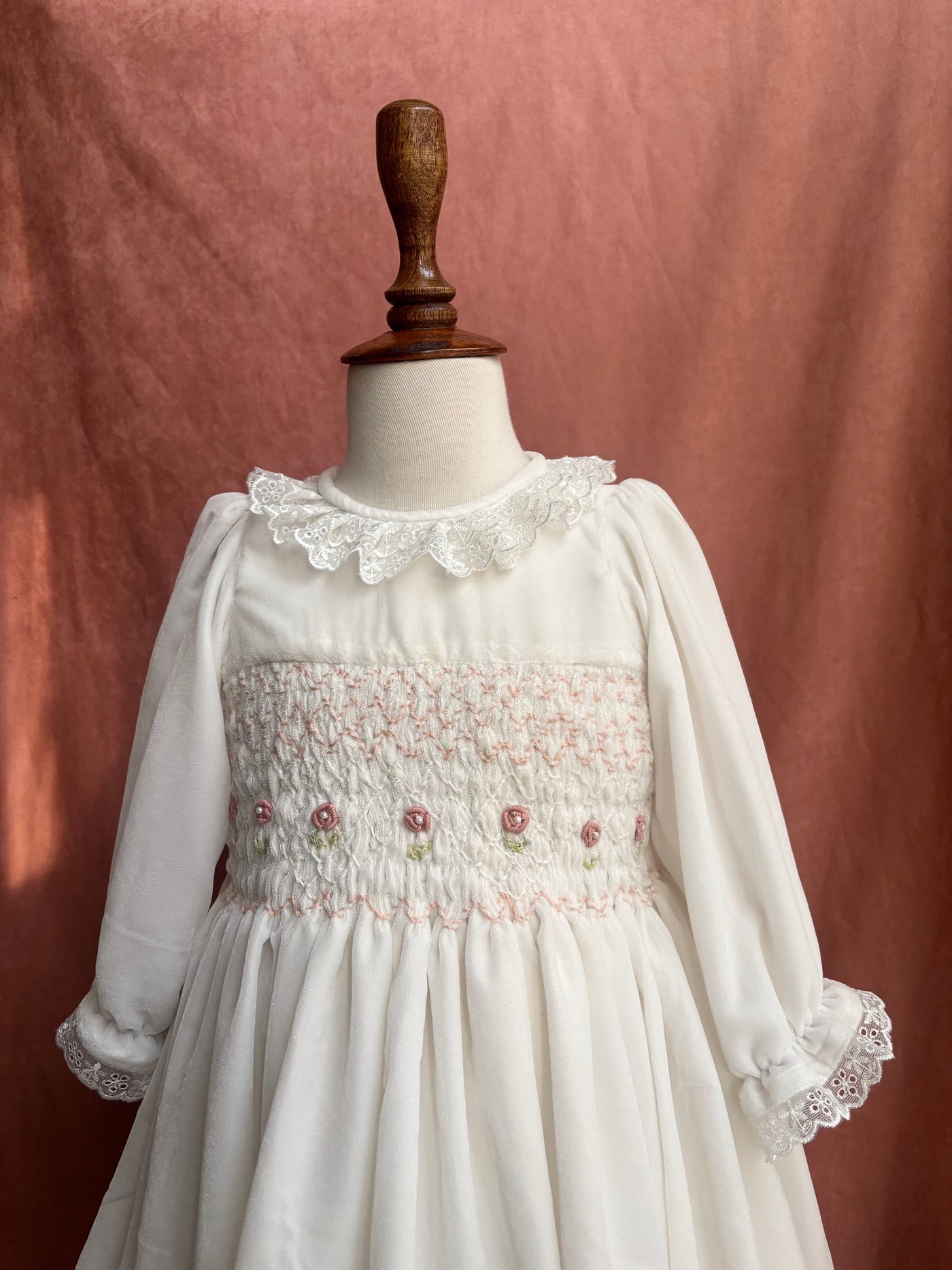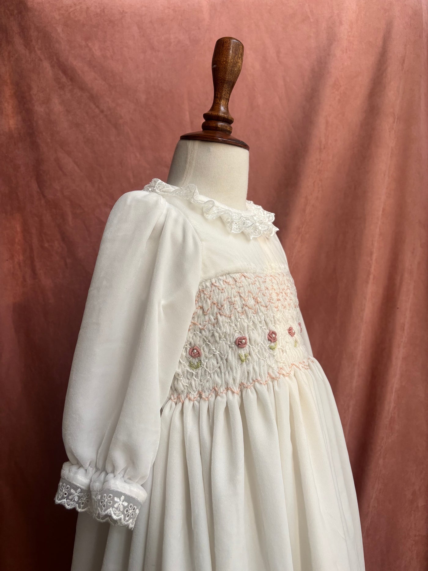 A festive velvet dress featuring hand-smocking, pearl accents, and delicate lace details. Perfect for winter celebrations.